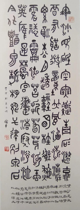 刘铁平, 笔名金夷,别号粱溪艇屋主,江苏常州人,祖籍江苏无锡,1946年生,江苏无锡人,国家一级美术师。自幼酷爱文史书画,少年时博临汉碑及先秦文字。擅四体书法,篆、隶俱佳。应文化部、上海市文化局、日本每日新闻社等邀请,曾在中国美术馆、上海、江苏美术馆,名古屋博物馆等举办个人书展及楹联书展。人民日报及海峡之声电台曾作长篇连载,以介绍其艺术成就。他是文化部最早向日本推荐的80位书家之一(1978年)。