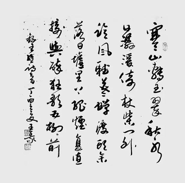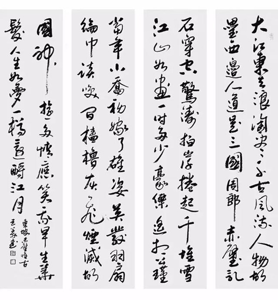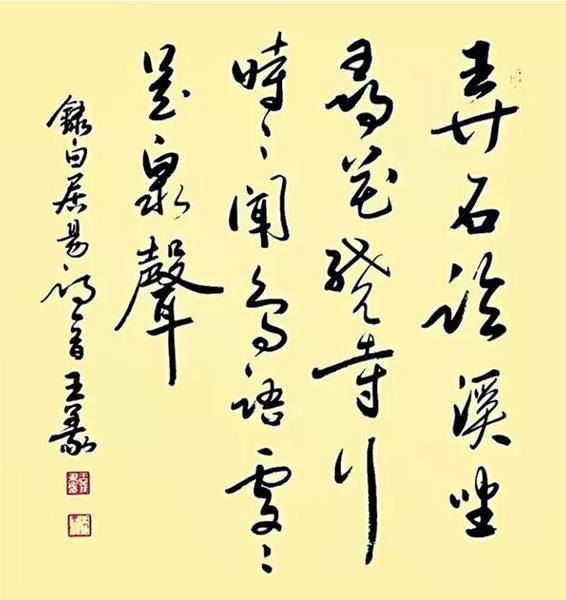 王义先生行草书功力深厚,不激不厉、淡定高古。书法是线条的艺术,线条又是书家书写功力的具体体现,王义正是深刻把握住了这一点,他的书法线条沉稳劲健、干净利落,而又飘逸洒脱,放朗大气,在笔墨点画之间,我们看到的是中国传统文化的博大精深及他强烈的个人风格。