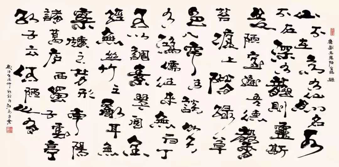 创新,是饶永才书法执着前行的修行姿态。他对法度不讲、臆乱胡写、传统不师、江湖走书的“伪创新”之风气不屑一顾,始终砥砺自己“守旧而不僵,创新而有矩”,数十载守寂不移,拓新不止。自幼喜爱上书法始,他观帖悟碑,先探金石篆隶之高古美质,继攻唐楷魏碑端庄谨严之形态,尔后追二王、习张旭……日月提纯,终形成了他独有的行草书风格。